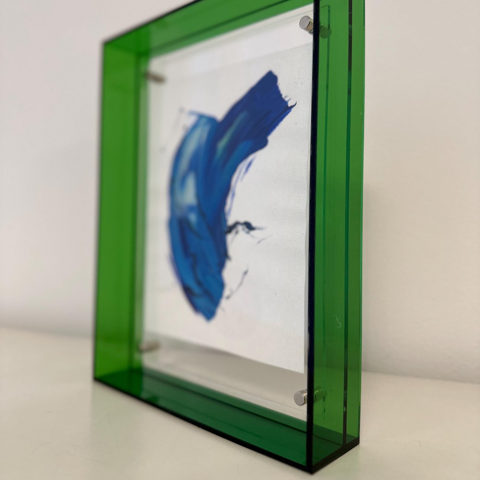 "Electric Waves" is a small, vibrant canvas painting that captures the energy of the sea through abstract expression. Various shades of blue echo the rhythm of waves, balancing calm and strength. Framed in green acrylic glass (16 x 21 cm), the piece gains a fresh, dynamic contrast that enhances its cool tones. A striking artwork for lovers of abstract and ocean-inspired art.