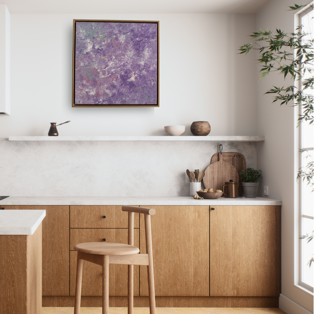 Painted in soft lilac and layered purples, this piece feels like emotional comfort—gentle, steady, and quietly uplifting. The subtle movement and stripes create a soothing rhythm, like a slow heartbeat that helps your mind settle and your body feel safe.